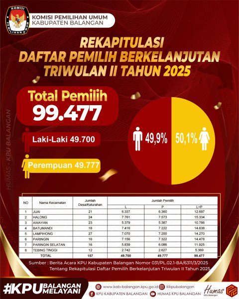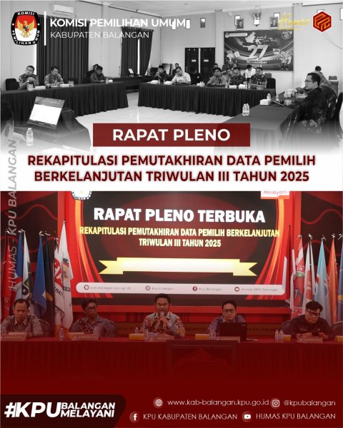 Pada Hari ini Kamis tanggal 02 Oktober 2025 KPU Kabupaten Balangan kembali melaksanakan Rapat Pleno Terbuka Rekapitulasi Pemutakhiran Data Pemilih Berkelanjutan Triwulan III Tahun 2025 yang dihadiri oleh Bawaslu Kabupaten Balangan dan Stakeholder terkait seperti Polres Balangan, Kodim 1001 Amt-Blg, Dinas Kependudukan dan Catatan Sipil Kabupaten Balangan, Badan Kesbangpol Kabupaten Balangan dan Kementrian Agama Kabupaten Balangan. Rapat Pleno Terbuka dibuka langsung oleh Ketua KPU Kabupaten Balangan yaitu Bapak Ahmad Turjani dan selanjutnya Rapat Pleno Terbuka dipimpin oleh Ketua Divisi Perencanaan, Data dan Informasi yaitu Bapak Suhaimi. Kegiatan dilaksanakan berdasarkan dari Peraturan Komisi Pemilihan Umum Republik Indonesia Nomor 1 Tahun 2025 tentang Pemutakhiran Data Pemilih Berkelanjutan, yang mana KPU Kab/Kota harus melaksanakan Rapat Pleno Terbuka setiap per Triwulan. Kegiatan tersebut merupakan kegiatan lanjutan dari kegiatan sebelumnya yang dilaksanakan pada tanggal 02 Juli 2025. Pada sesi diskusi, masing-masing peserta memberikan saran dan masukan serta dukungan terhadap proses Pemutakhiran Data Pemilih Berkelanjutan yang dilaksanakan oleh KPU Kabupaten Balangan, sehingga Rekapitulasi Pemutakhiran Data Pemilih Berkelanjutan Triwulan III Tahun 2025 KPU Kabupaten Balangan bisa ditetapkan dalam Berita Acara dengan jumlah pemilih Laki-laki berjumlah 49.657 pemilih dan pemilih Perempuan berjumlah 49.760 pemilih dengan total keseluruhan pemilih berjumlah 99.417 pemilih. ....