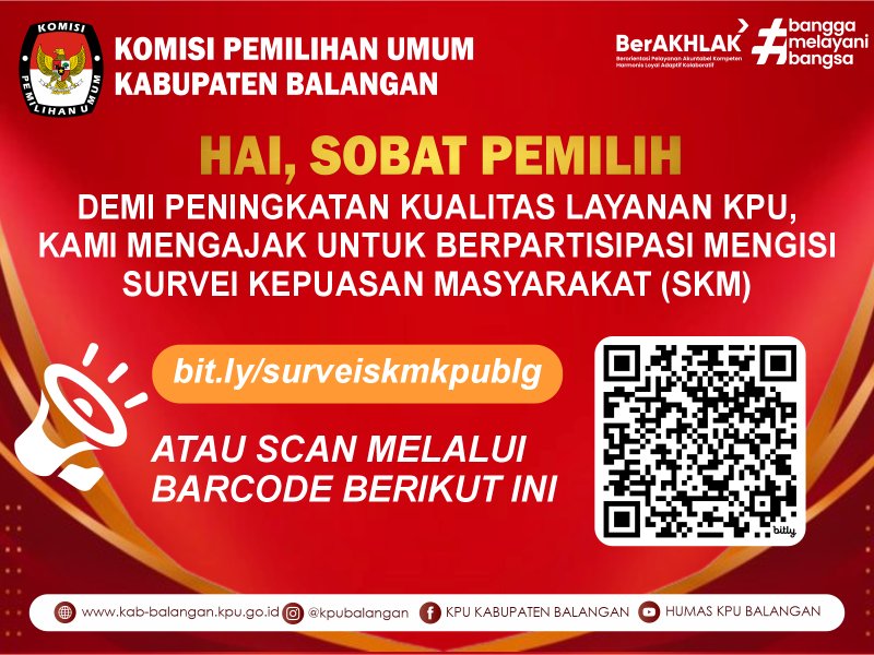 Sehubungan dengan Surat dari Komisi Pemilihan Umum Republik Indonesia Nomor : 2544/ORT.07-SD/01/2025 tanggal 28 Juli 2025 perihal Pelaksanaan Survei Kepuasan Masyarakat (SKM) dan Peraturan Menteri Pendayagunaan Aparatur Negara dan Reformasi Birokrasi (PANRB) Nomor 14 Tahun 2017 tentang Pedoman Penyusunan Survei kepuasan Masyarakat di Lingkungan Instansi Pemerintah dan dalam rangka pelaksanaan Evaluasi Reformasi Birokrasi KPU Tahun 2025. Setiap Instansi Pemerintahan wajin melaksanakan dan melaporkan hasil pelaksanaan Survei Kepuasan Masyarakat (SKM) paling sedikit 1 (satu) kali dalam setahun dan menyampaikan laporan hasil pelaksanaan SKM yang memuat Indeks Kepuasan Masyarakat (IKM) kepada Kementrian PANRB. Indeks Kepuasan Masyarakat (IKM) yang akan dinilai pada pelaksanaan evaluasi Reformasi Birokrasi Tahun 2025 adalah nilai IKM pada Periode Januari s.d Juni (semester pertama) Tahun 2025. Nilai IKM merupakan salah satu indeks dari 28 (dua puluh delapan) indeks penilaian meso pada pelaksanaan Evaluasi Reformasi Birokrasi Tahun 2025. link untuk Survei Kepuasan Masyarakat : https://bit.ly/surveiskmkpublg atau dengan Scan Barcode dibawah ini. ....
