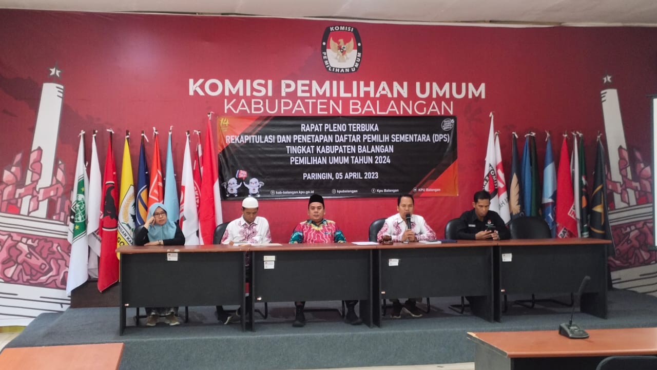 Komisi Pemilihan Umum (KPU) Kabupaten Balangan melaksanakan Rapat Pleno Terbuka Rekapitulasi dan Penetapan Daftar Pemilih Sementara (DPS) Pemilihan Umum Tahun 2024, di aula Kantor KPU KPU kabupaten Balangan pada Rabu, 05 April 2023.
