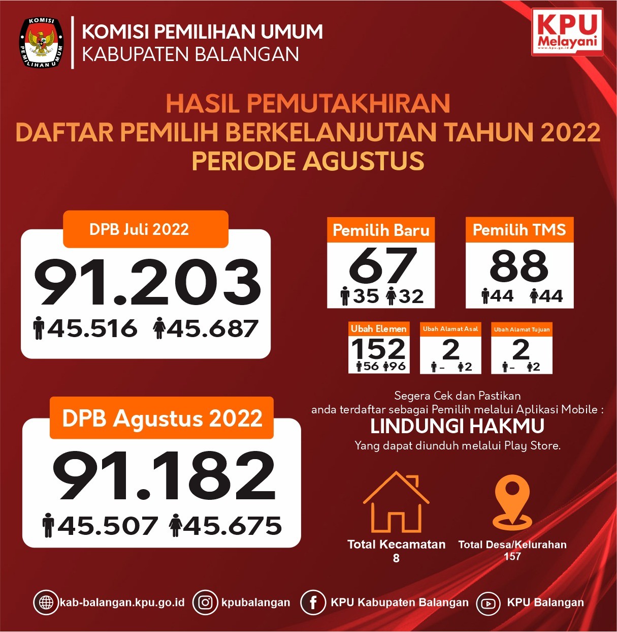Syahrani menjelaskan bahwa terjadi penurunan tehadap DPB Periode Agustus 2022 sebanyak 21 pemilih dibanding bulan Juli lalu. hal itu terjadi karena banyaknya pemilih yang tidak memenuhi syarat (pemilih pindah domisili dan meninggal dunia) dibanding pemilih baru. Selain itu, KPU Kabupaten Balangan menerima tanggapan dan masukan terhadap Data Pemilih dalam pelaksanaan Pemutakhiran Data Pemilih Berkelanjutan Tahun 2022 yang dapat disampaikan di kantor KPU Kabupaten Balangan atau melalui aplikasi lindungihakmu mobile yang dapat di download di playstore android, ucap Syahrani.