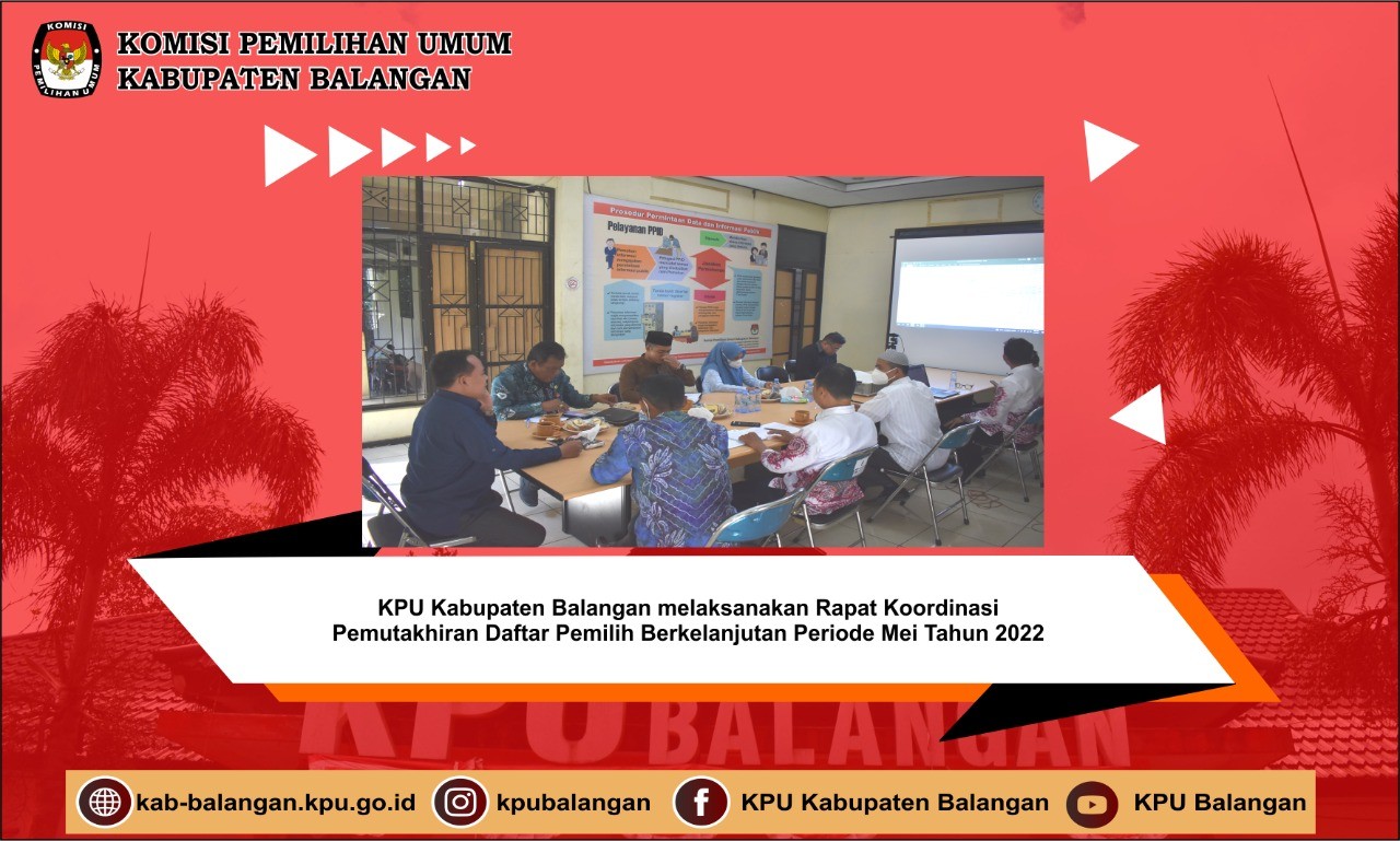 Komisi Pemilihan Umum (KPU) Kabupaten Balangan menggelar Rapat Koordinasi Daftar Pemilih Berkelanjutan (DPB) Tahun 2022 Periode Bulan Mei di Ruang Rapat KPU Kabupaten Balangan, Kamis (02/06/2022). Rapat Koordinasi dihadiri Ketua KPU Kabupaten Balangan Saripani dan Anggota KPU Kabupaten Balangan, Sekretaris KPU Kabupaten Balangan Wahyudiansyah, Kasubbag Perencanaan Data dan Informasi Khairir Rifhani serta staf Perencanaan, data dan informasi KPU Kabupaten Balangan. Rakor ini juga dihadiri Kepala Dinas Kependudukan dan Pencatatan Sipil Kabupaten Balangan Hifziani, Anggota Bawaslu Kabupaten Balangan Nizwar Elhamy dan Perwakilan Polres Balangan.Turut hadir secara daring dalam rapat tersebut Anggota KPU Provinsi Kalimantan Selatan Divisi Perencanaan, Data dan Informasi Siswandi Reya'an.