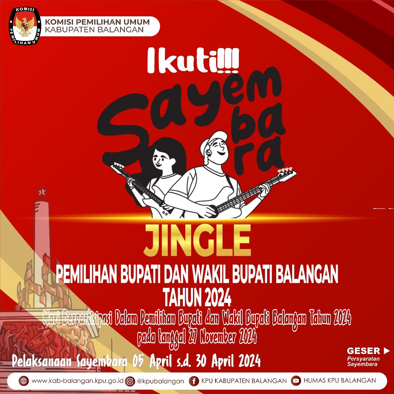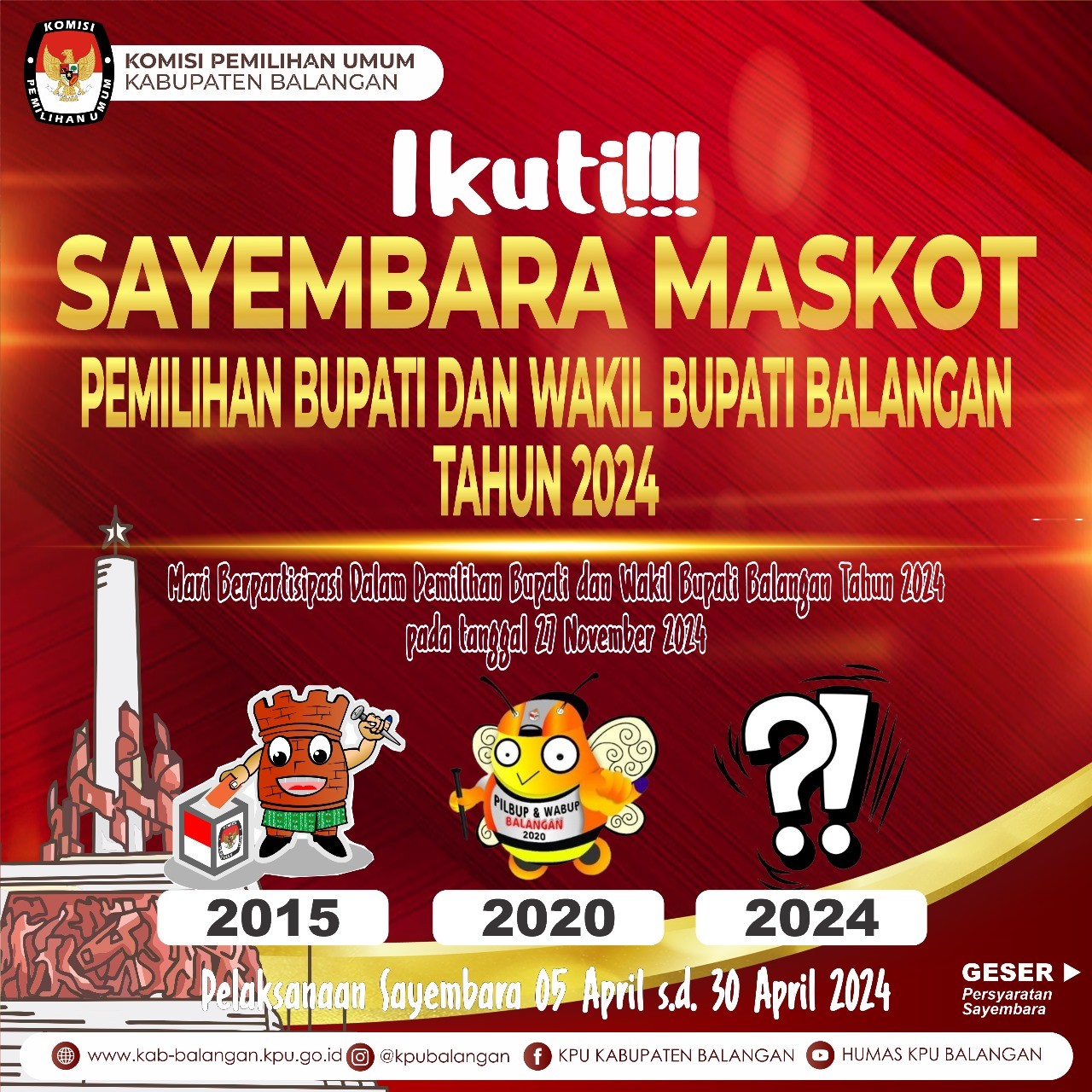 Bahwa dengan ini disampaikan dalam rangka Pemilihan Bupati dan Wakil Bupati Balangan Tahun 2024, Komisi Pemilihan Umum Kabupaten Balangan mengadakan Sayembara Cipta Desain Maskot dan Jingle Pemilihan Bupati dan Wakil Bupati Balangan Tahun 2024, adapun ketentuan pelaksanaan sayembara dapat di unduh melalui tautan di bawah ini :