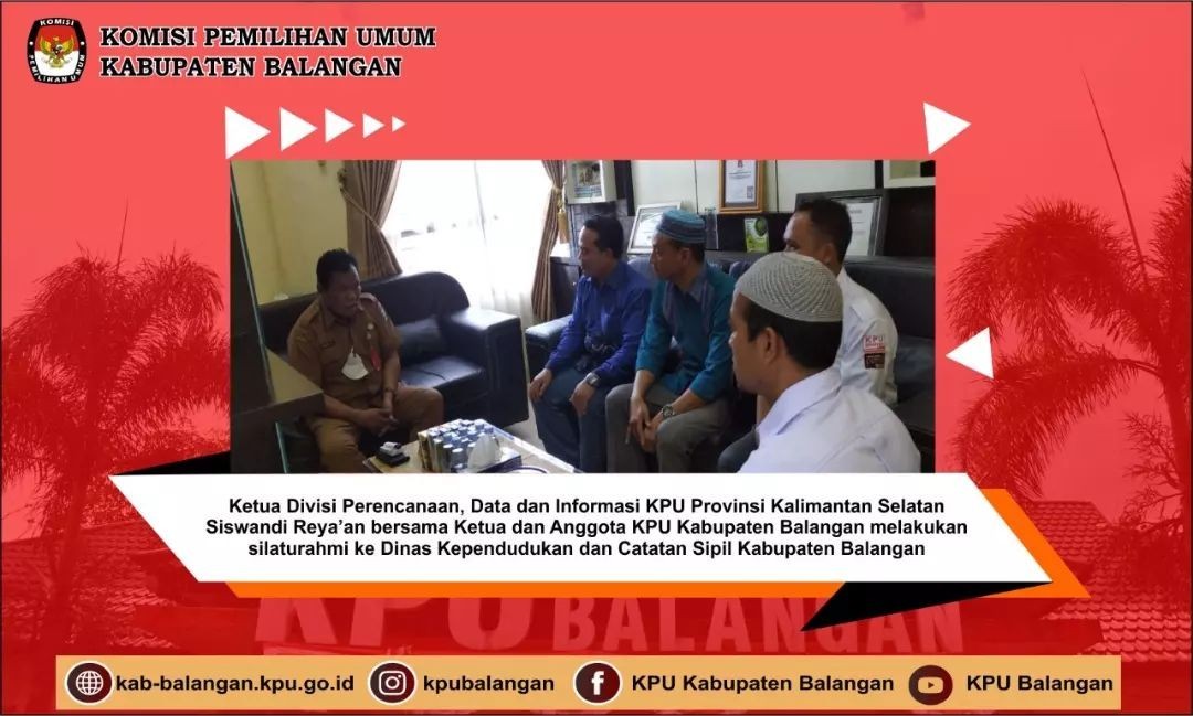 Ketua Divisi Perencanaan, Data dan Informasi KPU Provinsi Kalimantan Selatan Siswandi Reya’an bersama Ketua dan Anggota KPU Kabupaten Balangan melakukan silaturahmi ke Dinas Kependudukan dan Catatan Sipil Kabupaten Balangan pada hari Senin (23/5) dalam rangka koordinasi kegiatan Pemutakhiran Daftar Pemilih Berkelanjutan (PDPB) dan persiapan Pemilu Serentak Tahun 2024. Kedatangan tersebut diterima langsung oleh Kepala Dinas Dukcapil Kabupaten Balangan Hifziani.