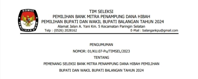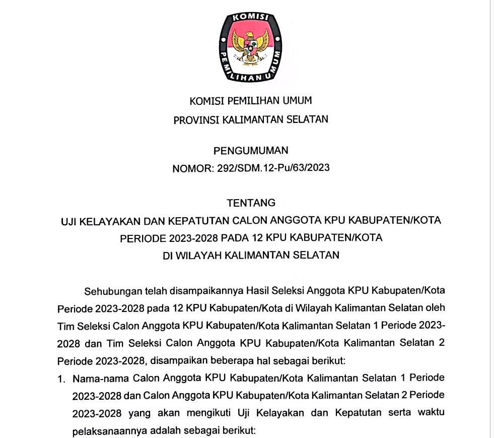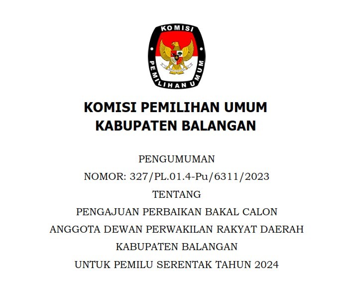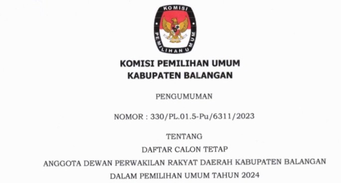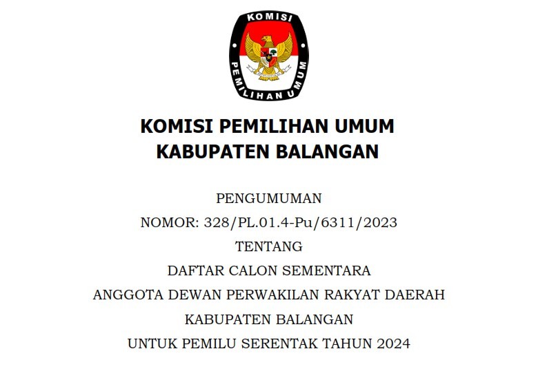 Bahwa untuk melaksanakan ketentuan Pasal 85 Peraturan Komisi Pemilihan Umum Nomor 10 Tahun 2023 tentang Pencalonan Anggota Dewan Perwakilan Rakyat, Dewan Perwakilan Rakyat Daerah Provinsi, dan Dewan Perwakilan Rakyat Daerah Kabupaten/Kota dan berdasarkan Keputusan Komisi Pemilihan Umum Kabupaten Balangan Nomor 223 Tahun 2023 tentang Daftar Calon Tetap Anggota Dewan Perwakilan Rakyat Daerah Kabupaten Balangan dalam Pemilihan Umum Tahun 2024 tanggal 3 November 2023, KPU Kabupaten Balangan mengumumkan Daftar Calon Tetap (DCT) Anggota Dewan Perwakilan Rakyat Daerah Kabupaten Balangan dan persentase keterwakilan perempuan dalam DCT sebagaimana terlampir.