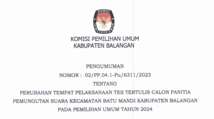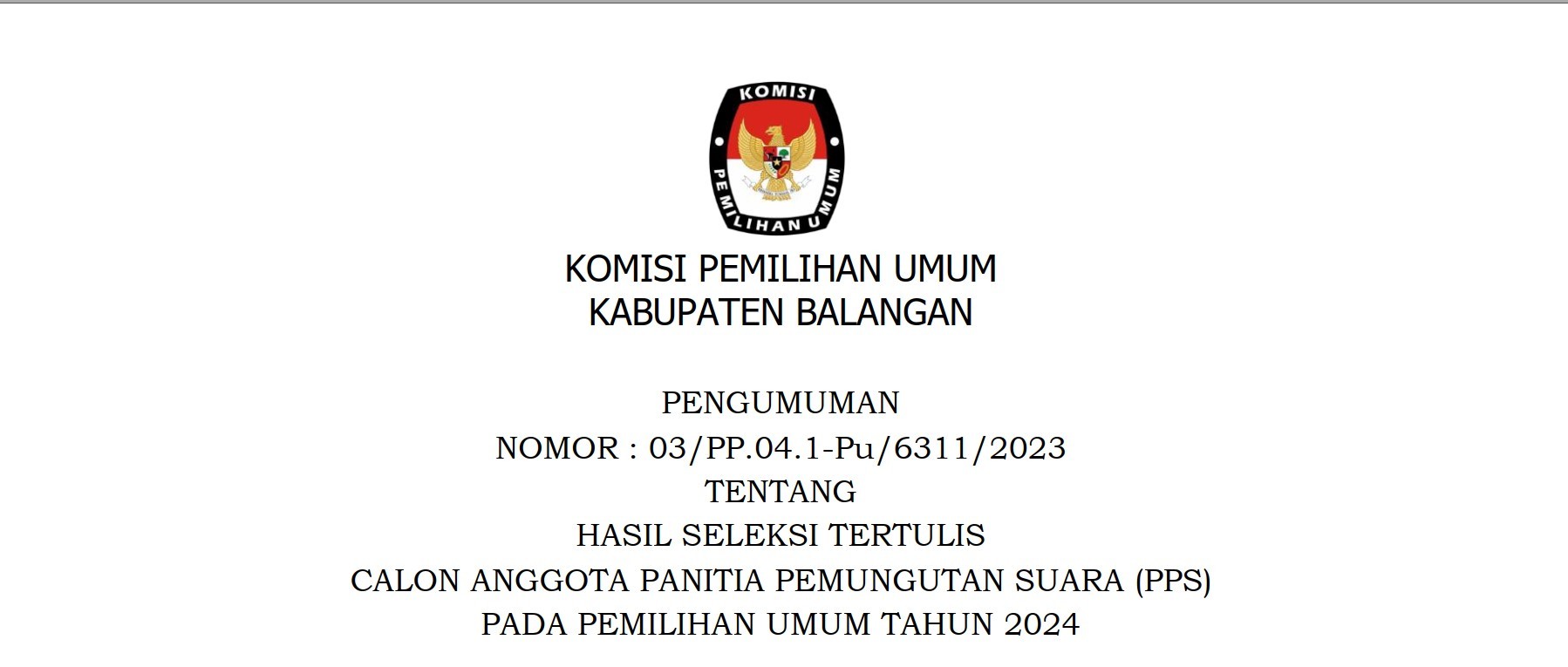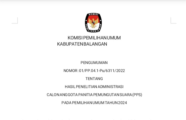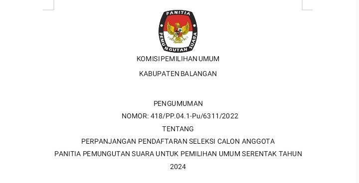 Sehubungan dengan hal tersebut, KPU Kabupaten Balangan, membuka perpanjangan waktu pendaftaran seleksi calon anggota Panitia Pemungutan Suara pada kelurahan/desa.