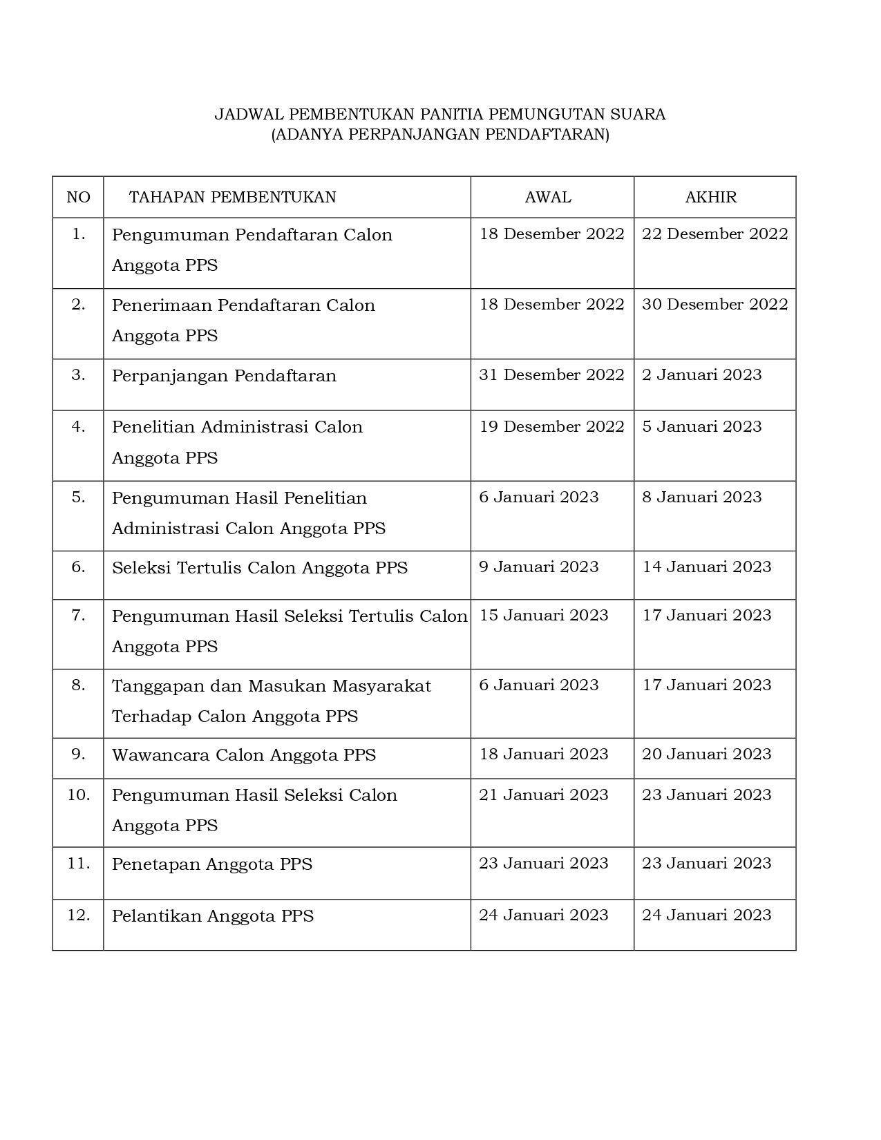 Berdasarkan Keputusan Komisi Pemilihan Umum Nomor 534 Tahun 2022 tentang Perubahan atas Keputusan Komisi Pemilihan Umum 476 Tahun 2022 tentang Pedoman Teknis Pembentukan Badan Adhoc Penyelenggara Pemilihan Umum dan Pemilihan Gubernur dan Wakil Gubernur Bupati dan Wakil Bupati dan Walikota dan Wakil Walikota, menyampaikan bahwa perpanjangan pendaftaran dilakukan dalam hal sampai dengan masa pendaftaran berakhir tidak ada peserta yang mendaftar atau kurang dari 2 (dua) kali jumlah PPS yang dibutuhkan, membuka 1 (satu) kali perpanjangan waktu pendaftaran selama 3 (tiga) Hari