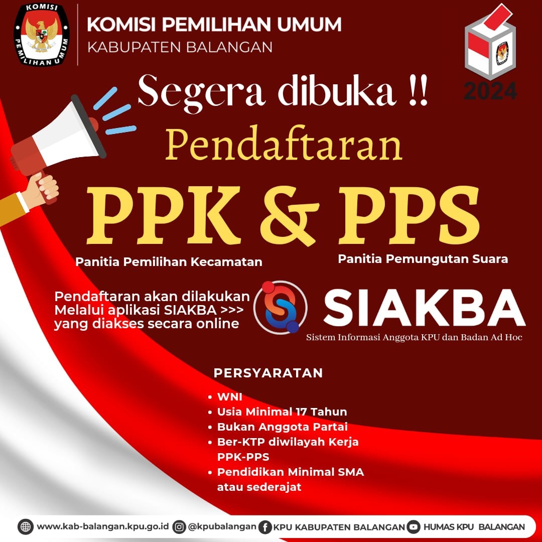 Pendaftaran penyelenggara badan adhok Pemilu 2024 akan dilakukan online menggunakan aplikasi SIAKBA (Sistem Informasi Anggota KPU dan Badan Adhok). Rencananya rekrutmen PPK, PPS, dan KPPS akan dimulai pertengahan November 2022 mendatang.